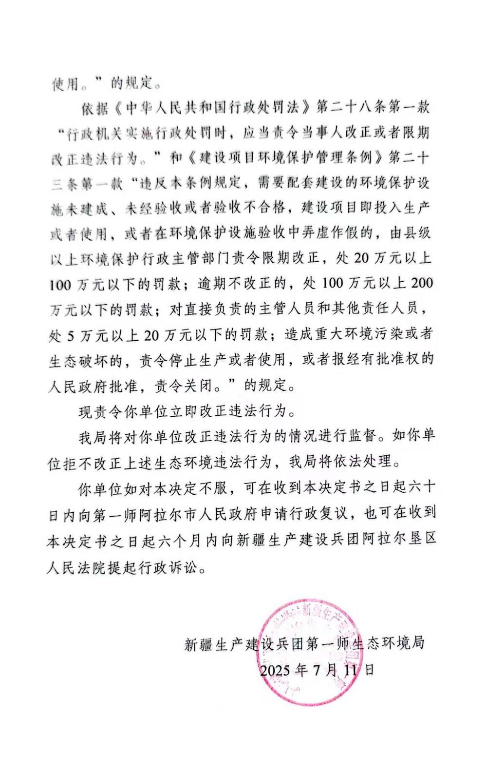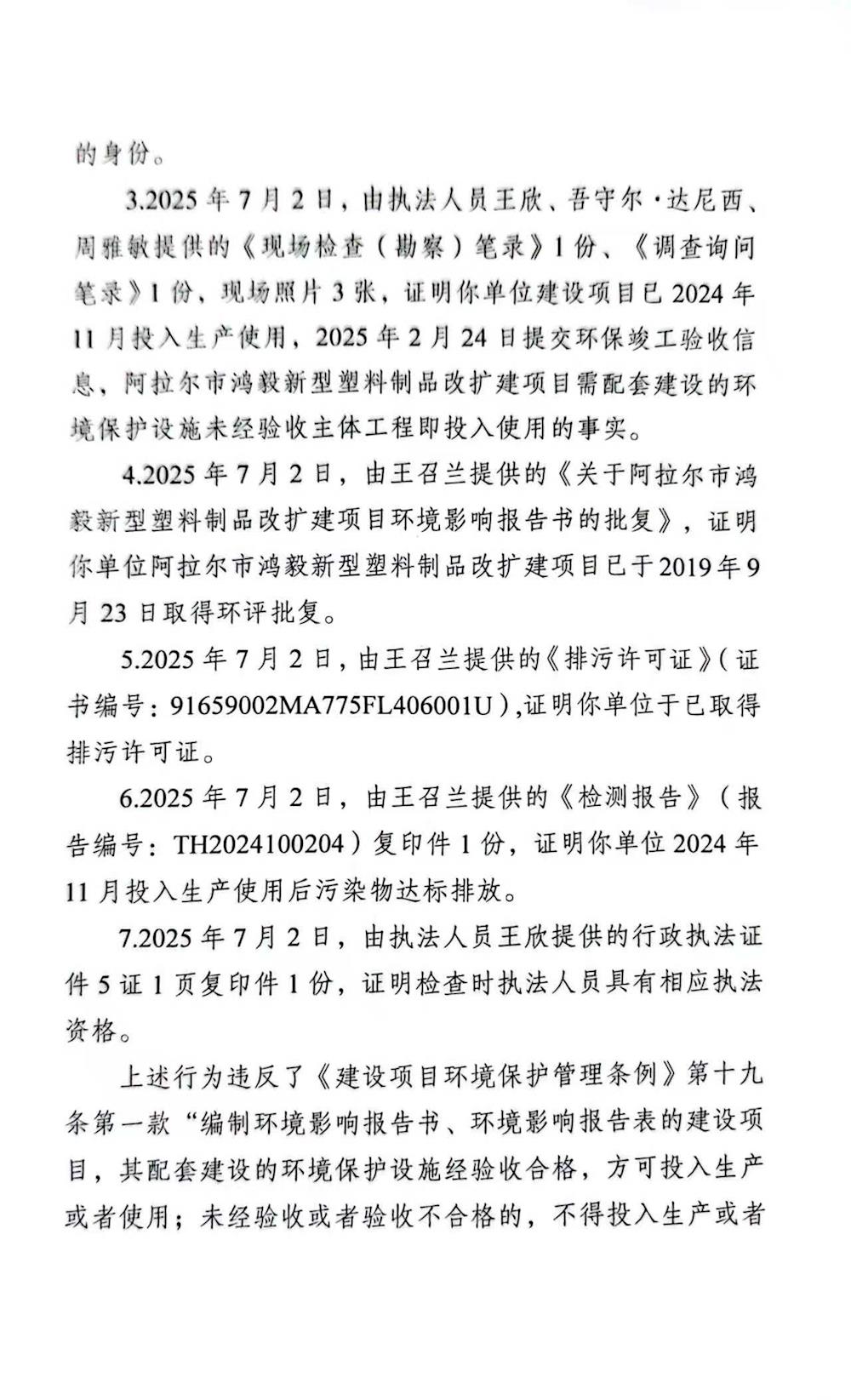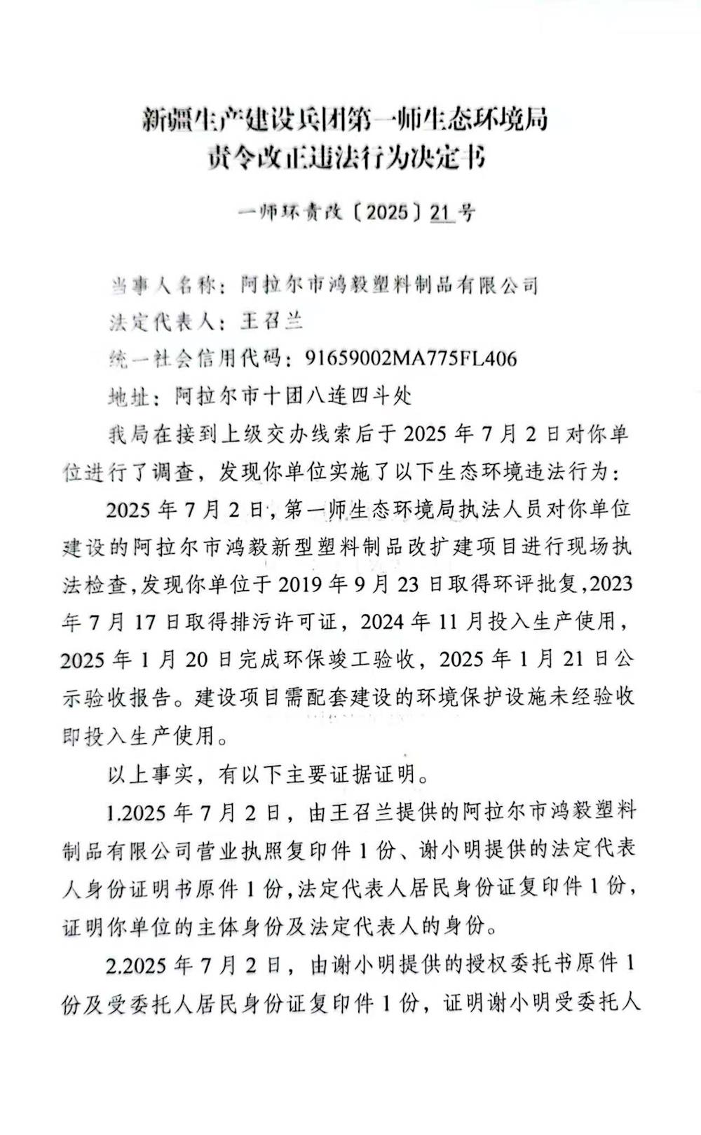關于阿拉爾市鴻毅塑料制品有限公司《責令改正違法行為決定書》21號的公示