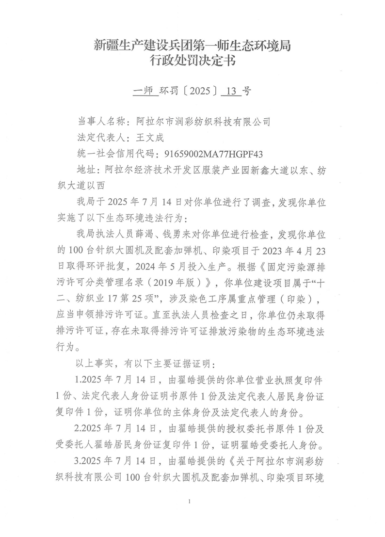 關(guān)于阿拉爾市潤(rùn)彩紡織科技有限公司《行政處罰決定書(shū)》的公示