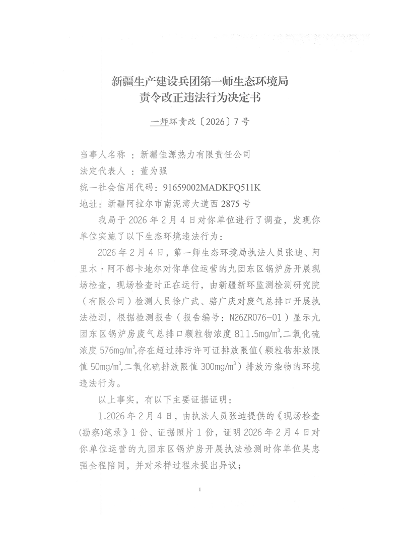 關于新疆佳源熱力有限責任公司《責令改正違法行為決定書》一師環責改〔2026〕7號的公示