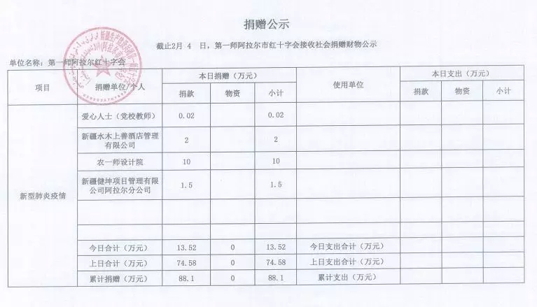 第一師阿拉爾市紅十字會接收社會捐贈財務公示