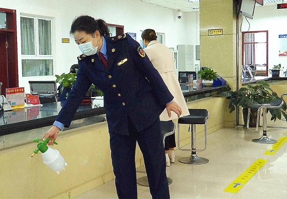 在開通窗口業務辦理的同時,該局每天定期對窗口區域進行消毒,實時測體溫、實名登記身份信息,引導辦事群眾保持1.5米的安全距離有序排隊等候。