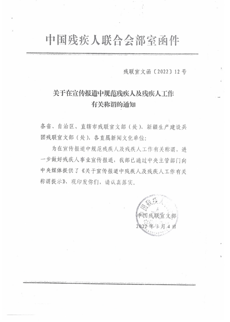 轉發《關于在宣傳報道中規范殘疾人及殘疾人工作有關稱謂的通知》