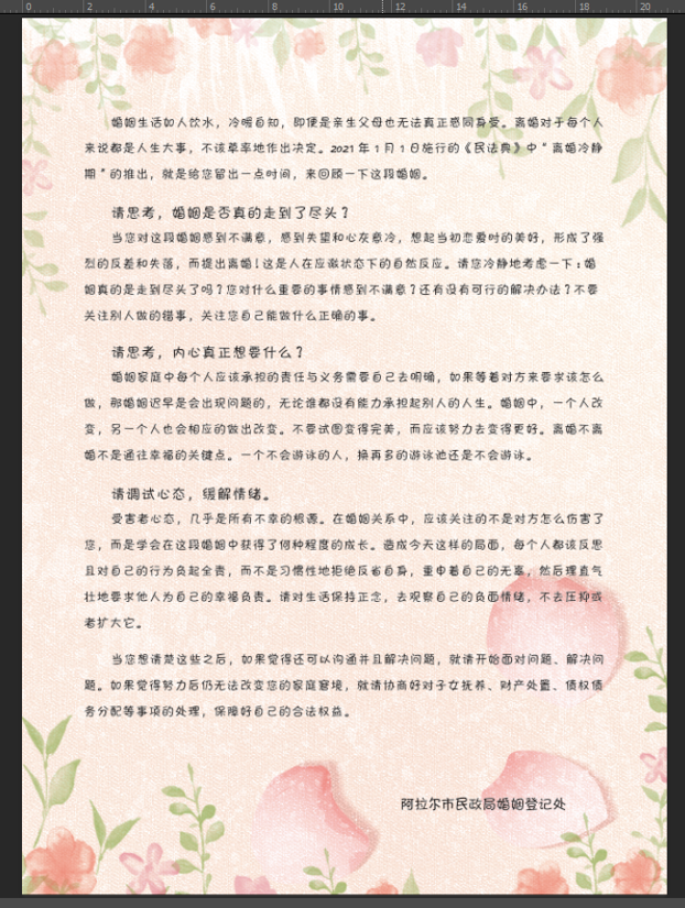 近年來,因一時沖動來辦理離婚的年輕夫妻不少,影響了正常的婚姻家庭秩序,也讓非理性離婚行為逐年攀高。為貫徹民法典有關離婚冷靜期制度的規定,阿拉爾市婚姻登記處從辦事群眾需求出發,及時調整、整合告知材料咨詢或申請離婚的群眾均會收到一涵蓋離婚登記所需證件材料告知單避免因告知不全造成群眾來回跑”、“重復跑。窗口工作人員以一份提醒、多一耐心、多一責任、多一擔當的服務意識提升整體服務效能,有效避免了群眾因不知曉政策法規而導致的矛盾。同時為申請離婚的群眾贈送《致婚姻當事人的一封信》引導其樹立正確的婚姻觀、家庭觀,增強夫妻間的溝通和交流技巧,提升自我解決婚姻家庭糾紛的能力,幫助當事人挽救尚未破裂的婚姻關系,更好地實現離婚冷靜期所承載的法律功能。截至4月24日,阿拉爾市婚姻登記處申請離婚440對,主動撤回或暫緩不離133對,離婚登記辦結307對,撤回率達30%。