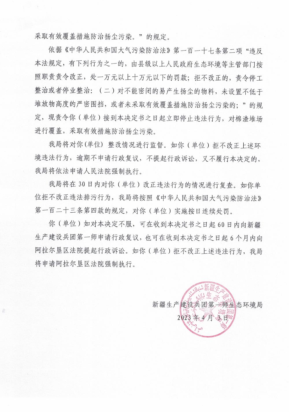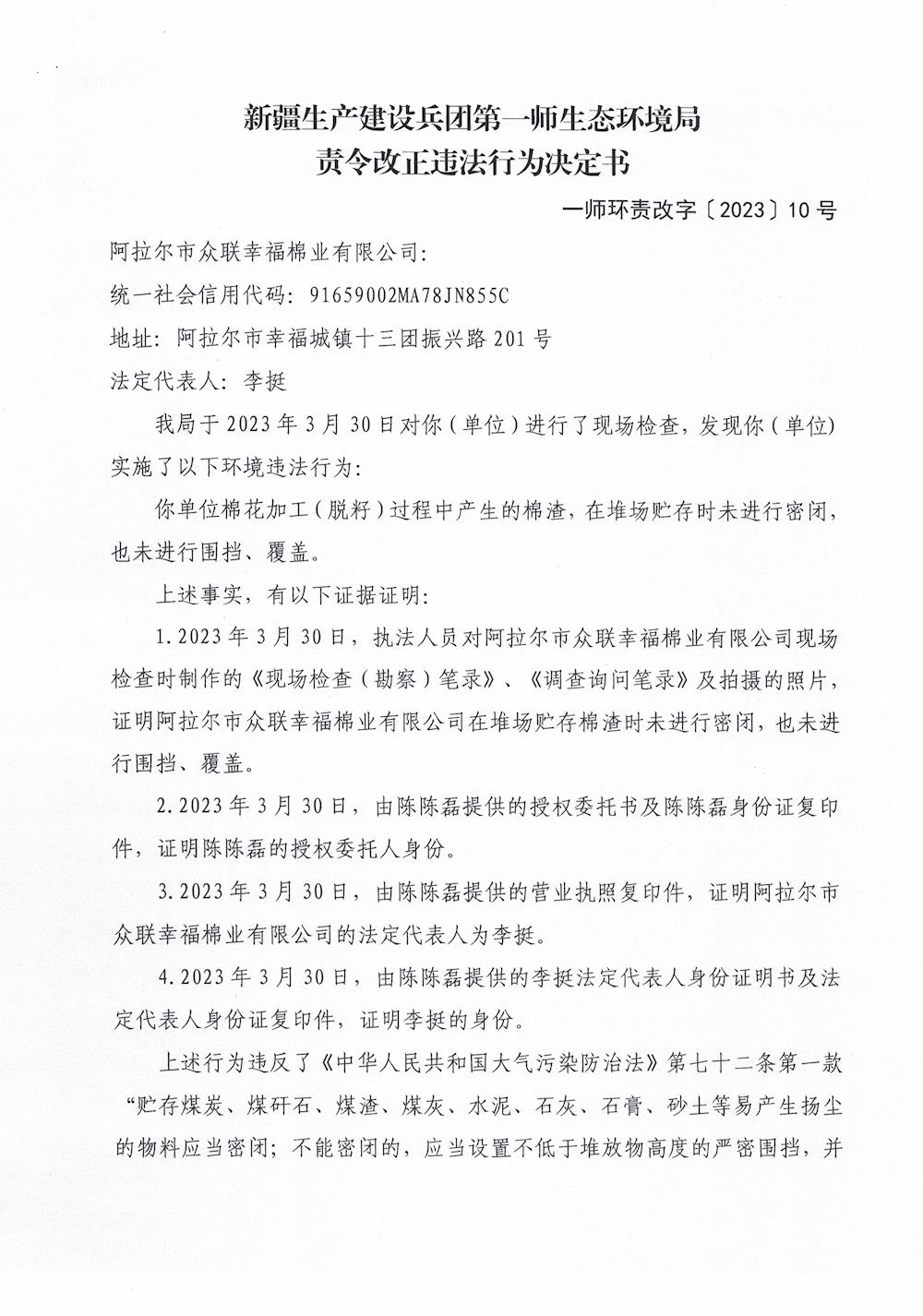 關于阿拉爾市眾聯幸福棉業有限公司《責令改正違法行為決定書》的公示