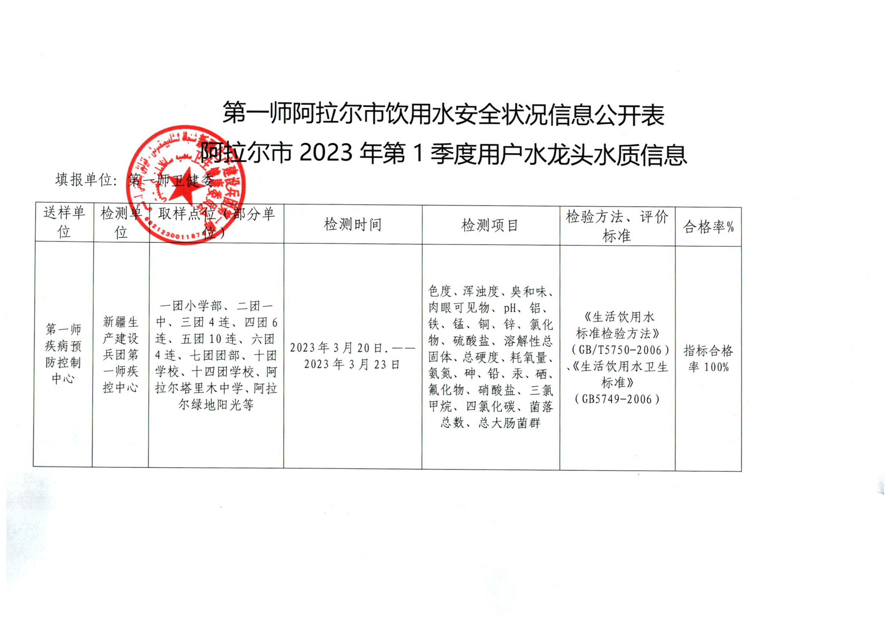 第一師阿拉爾市2023年第一季度 水質安全狀況信息