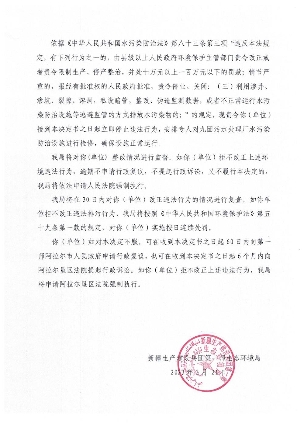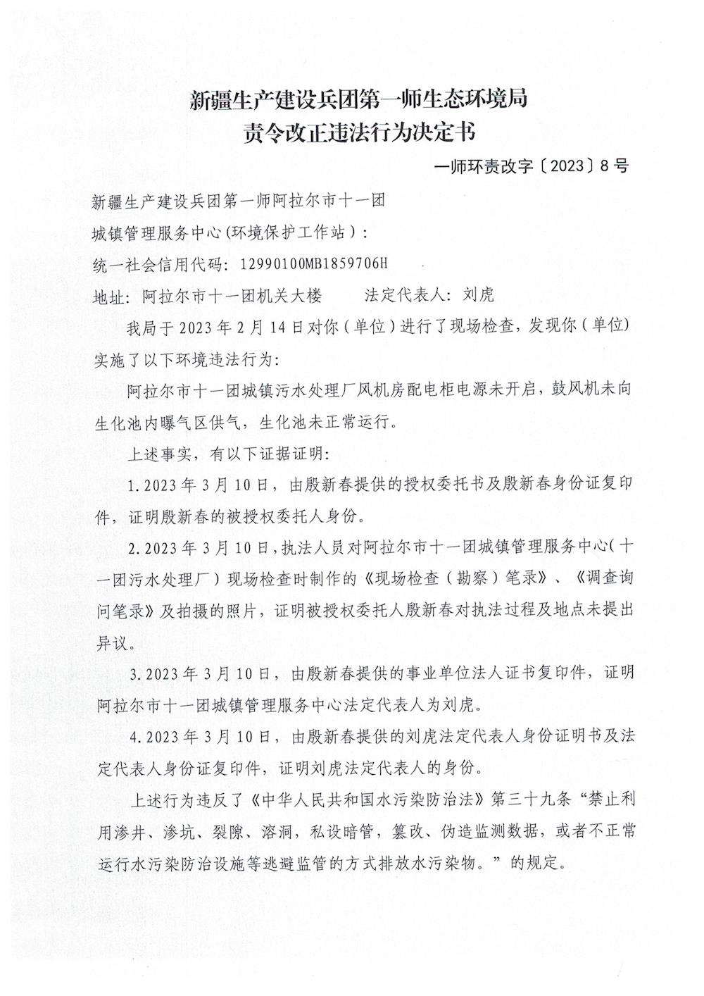 關于對新疆生產建設兵團第一師阿拉爾市十一團城鎮管理服務中心(環境保護工作站)《責令改正違法行為決定書》的公示