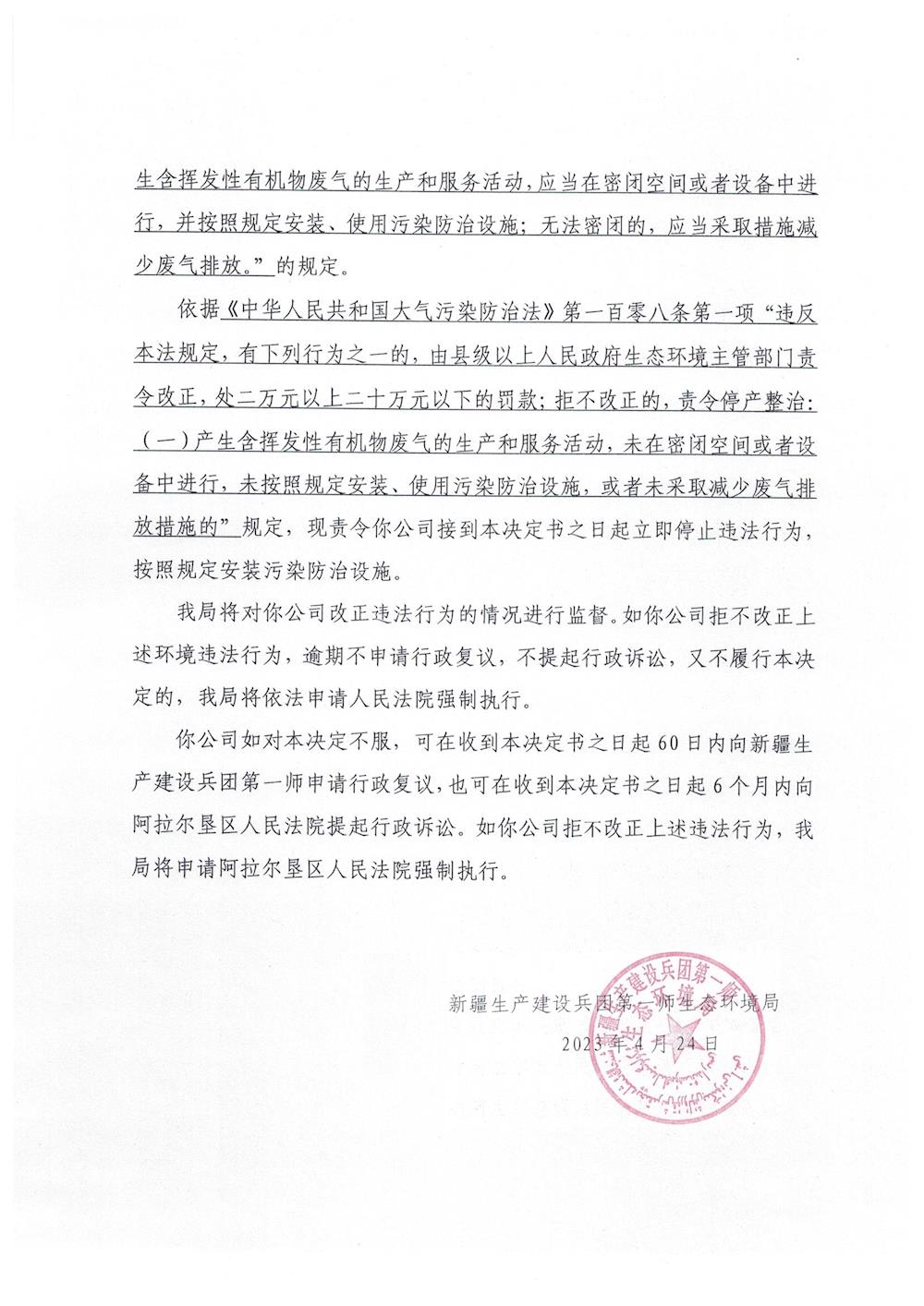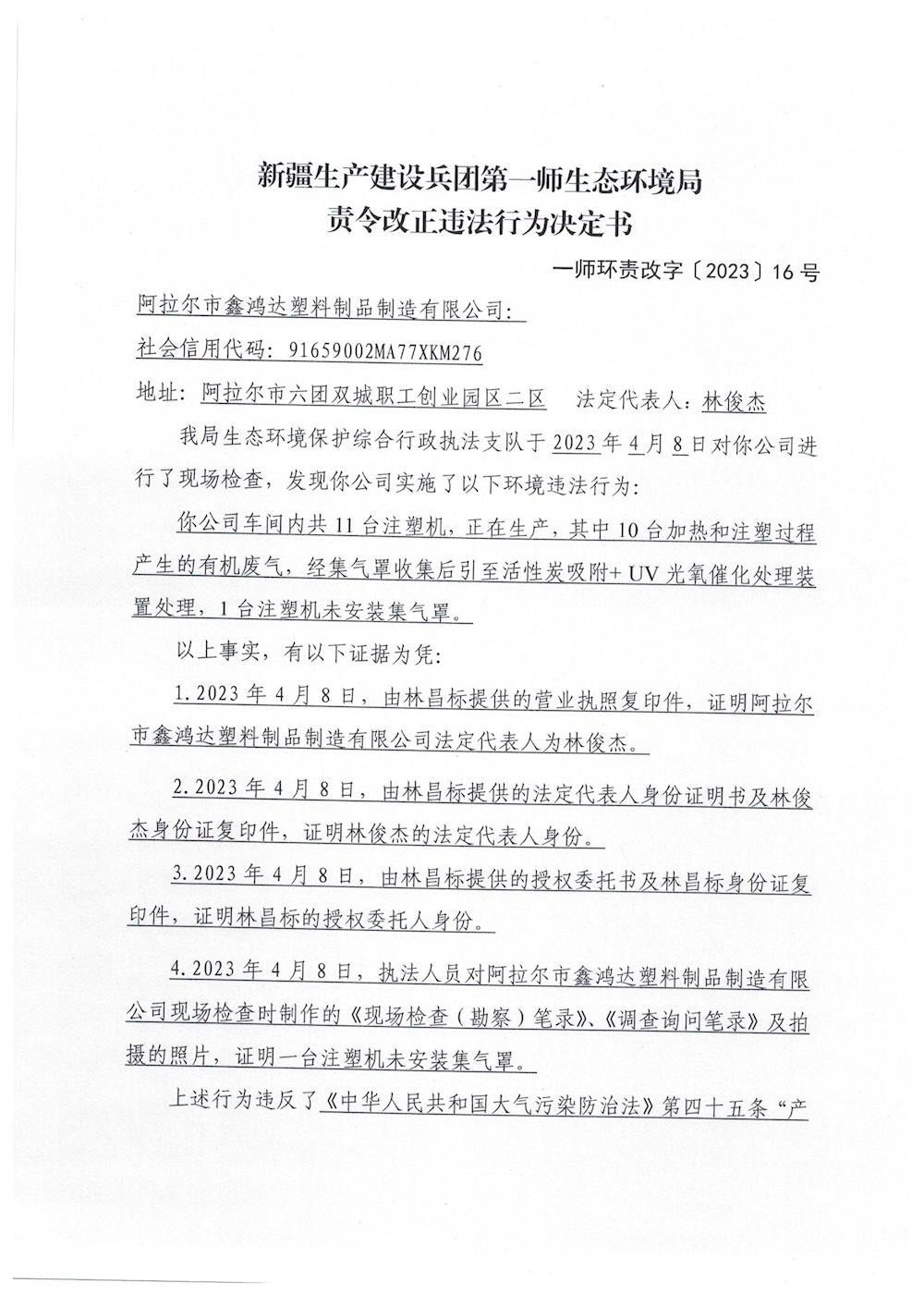 關于對阿拉爾市鑫鴻達塑料制品制造有限公司《責令改正違法行為決定書》的公示