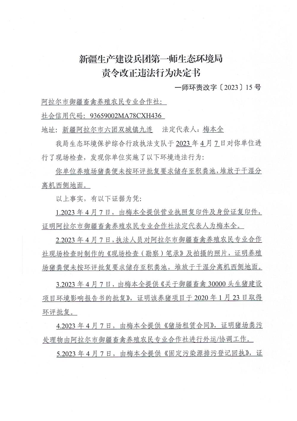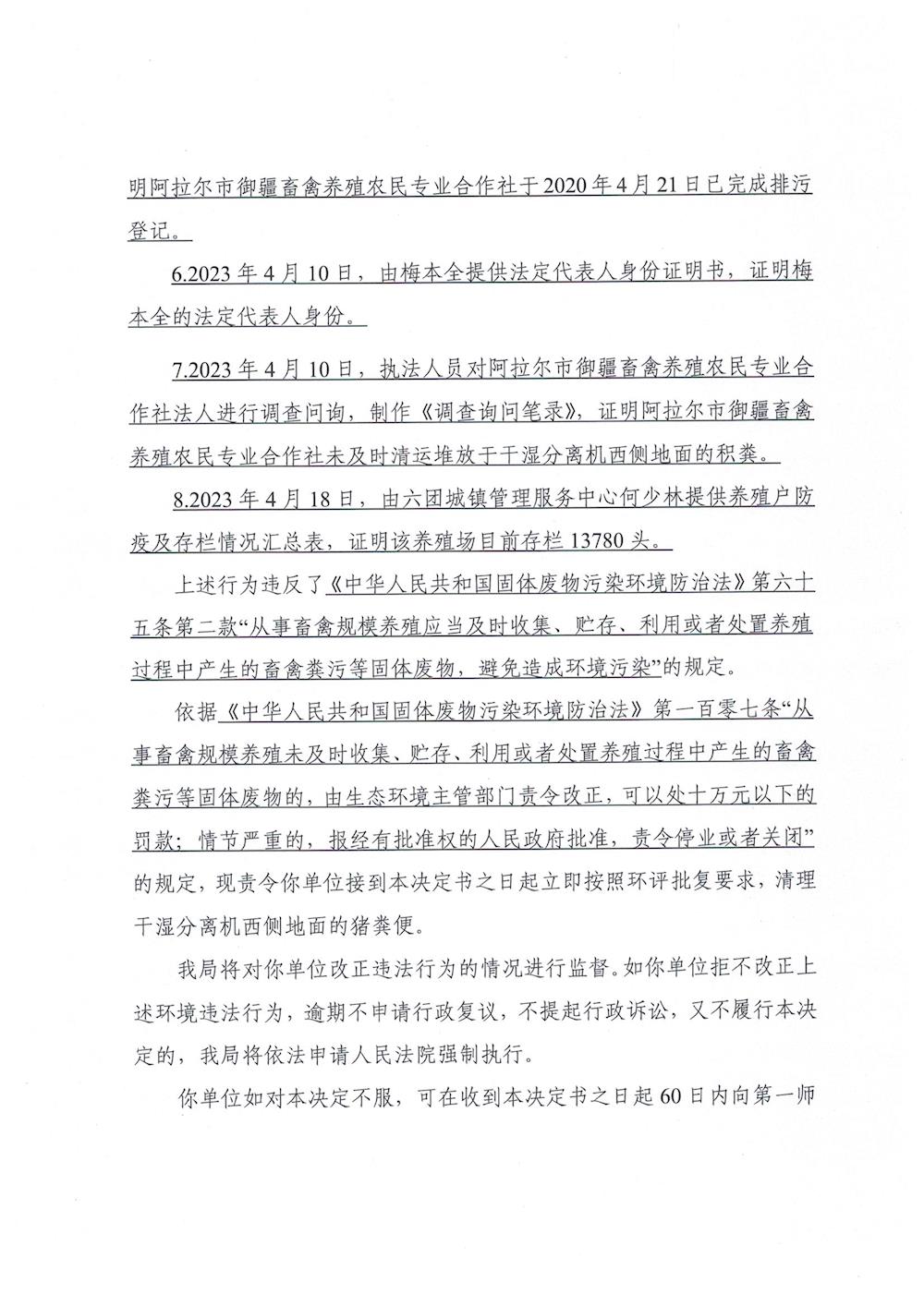 關于對阿拉爾市御疆畜禽養殖農民專業合作社《責令改正違法行為決定書》的公示