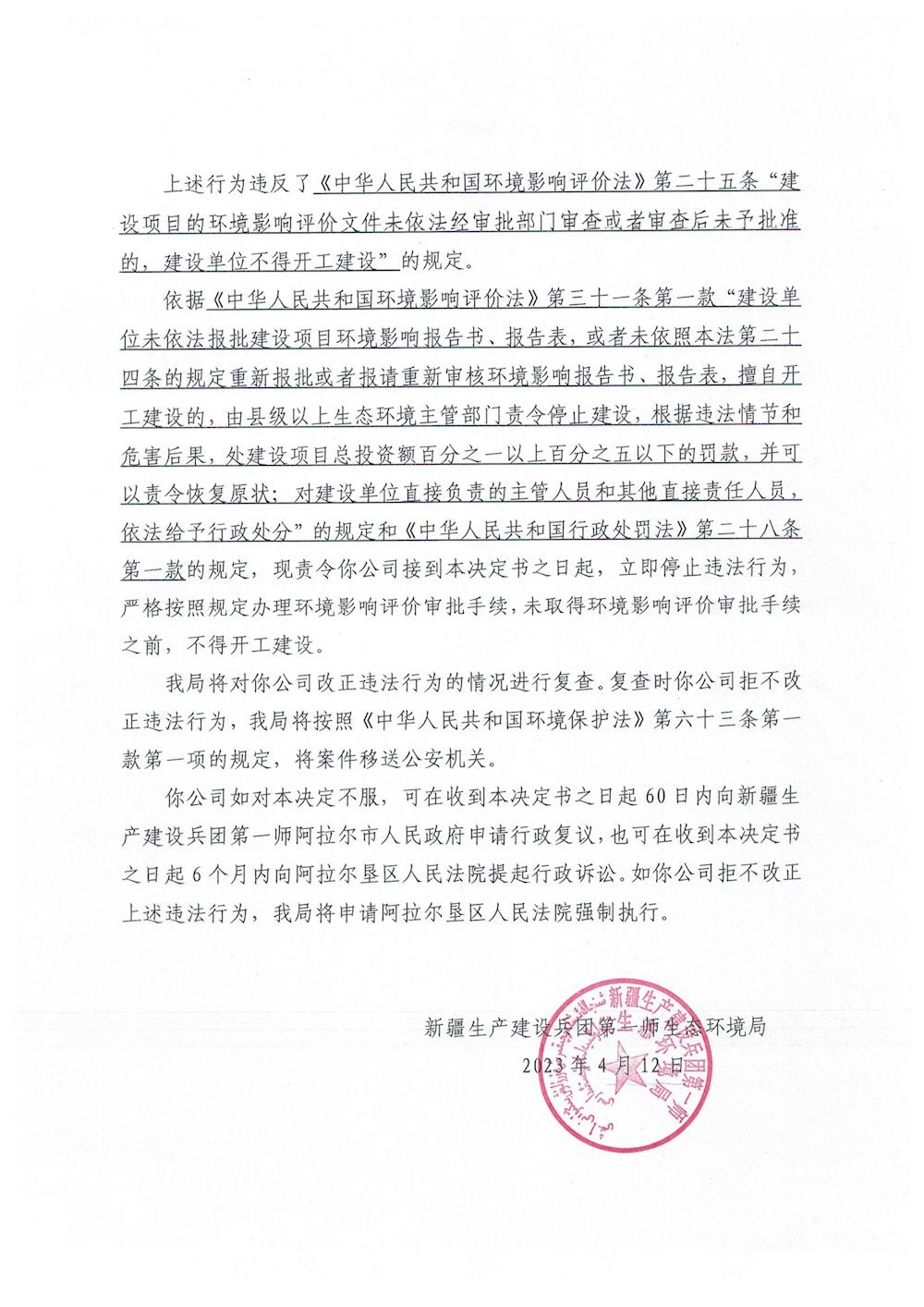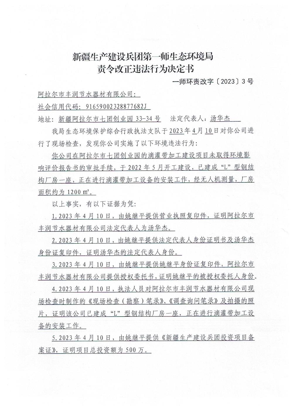 關于對阿拉爾市豐潤節水器材有限公司《責令改正違法行為決定書》的公示