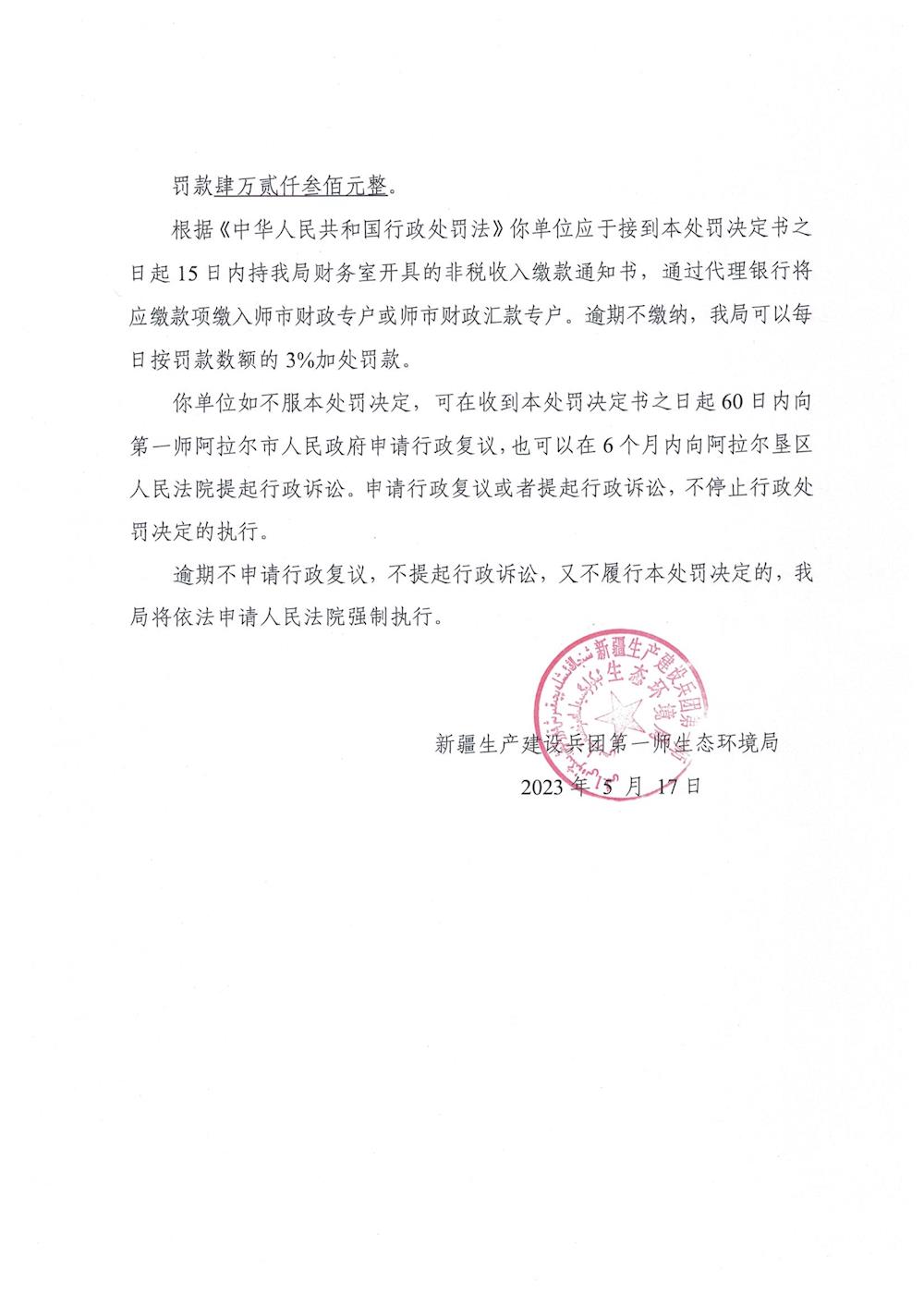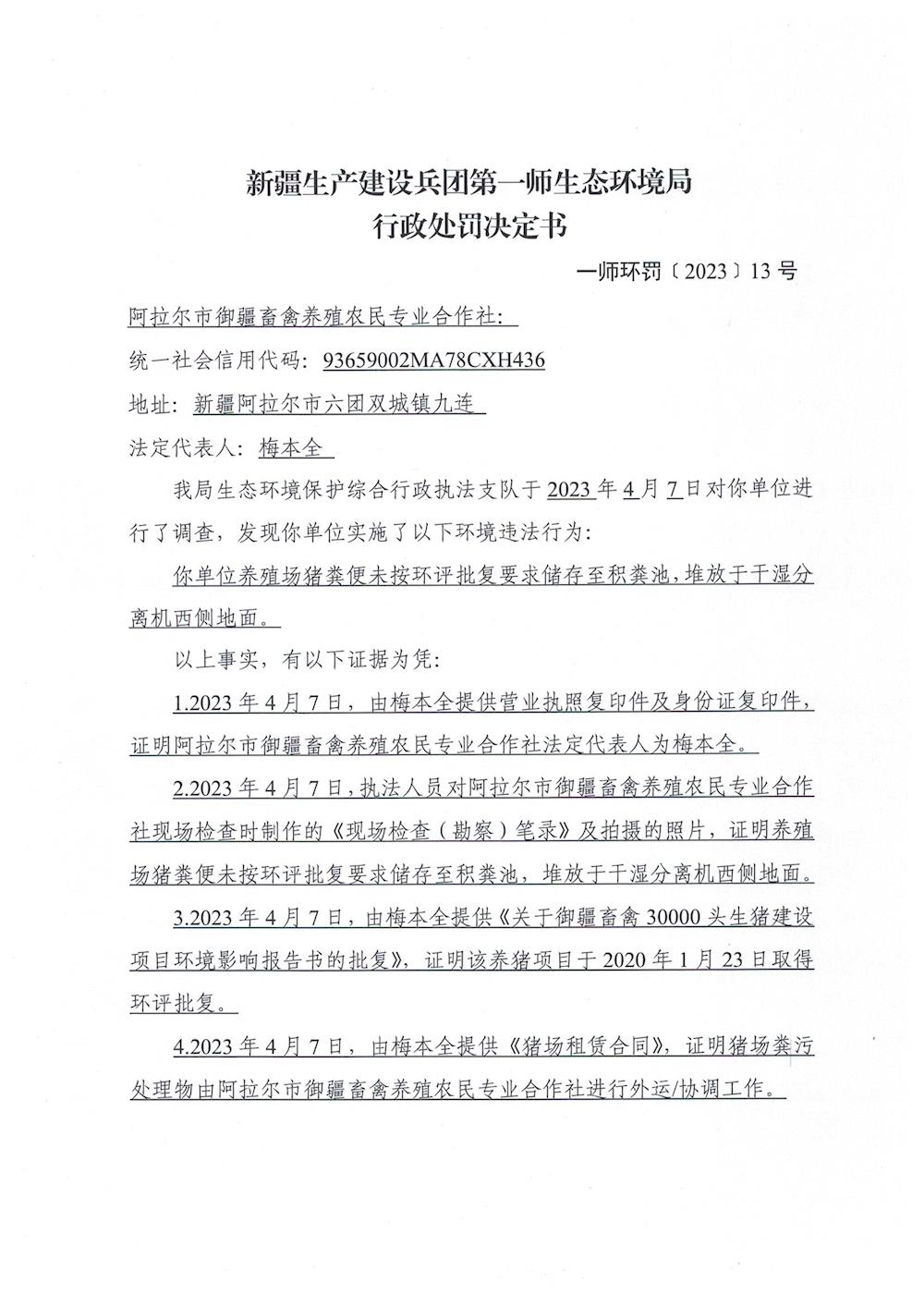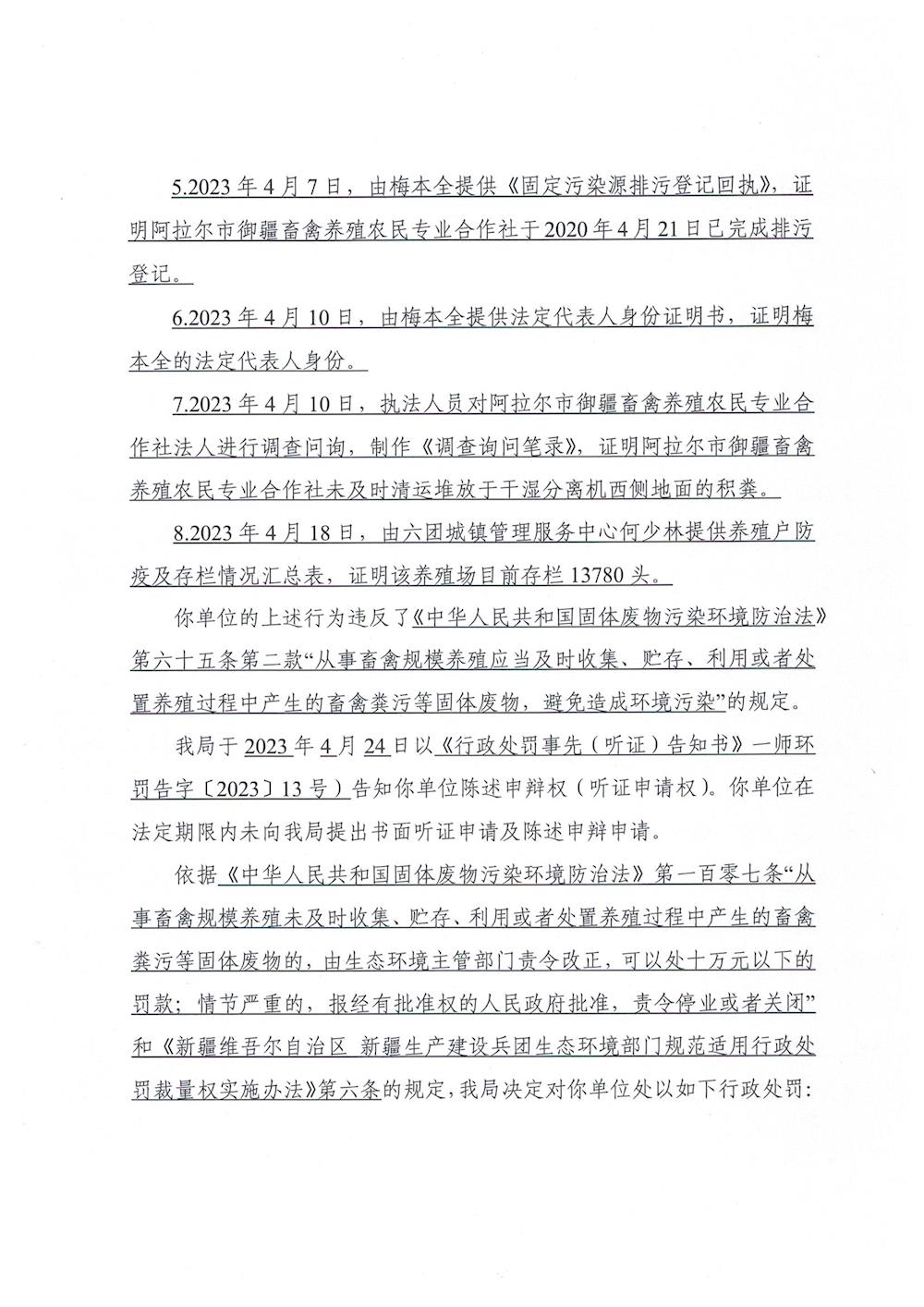關于對阿拉爾市御疆畜禽養殖農民專業合作社《行政處罰決定書》的公示
