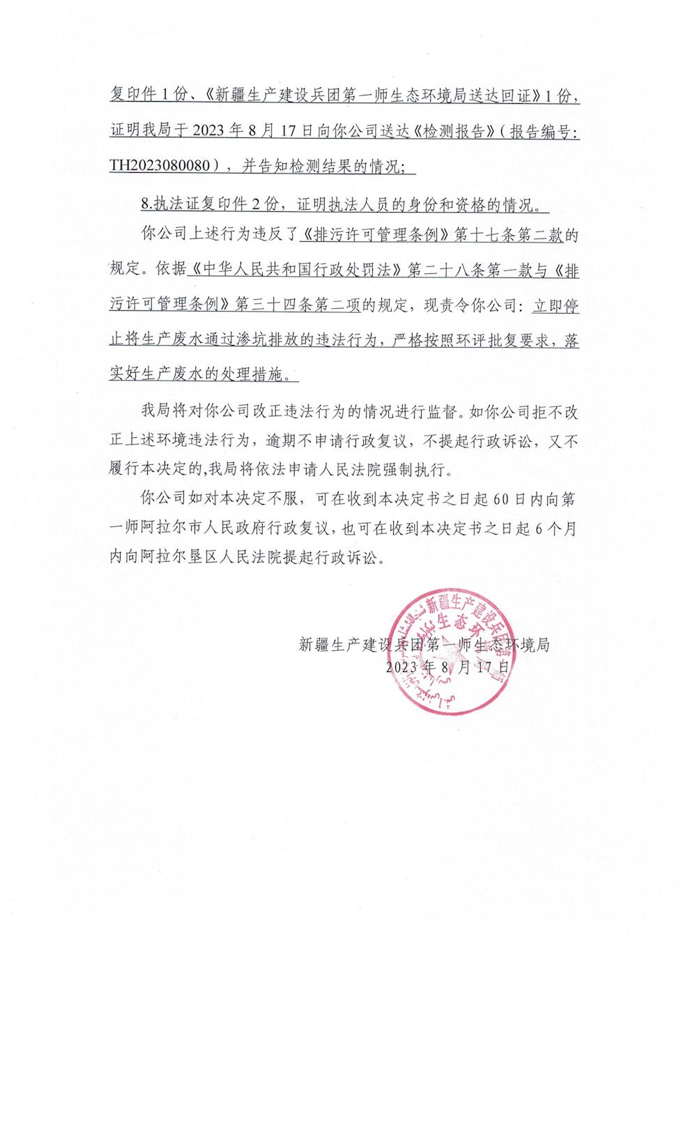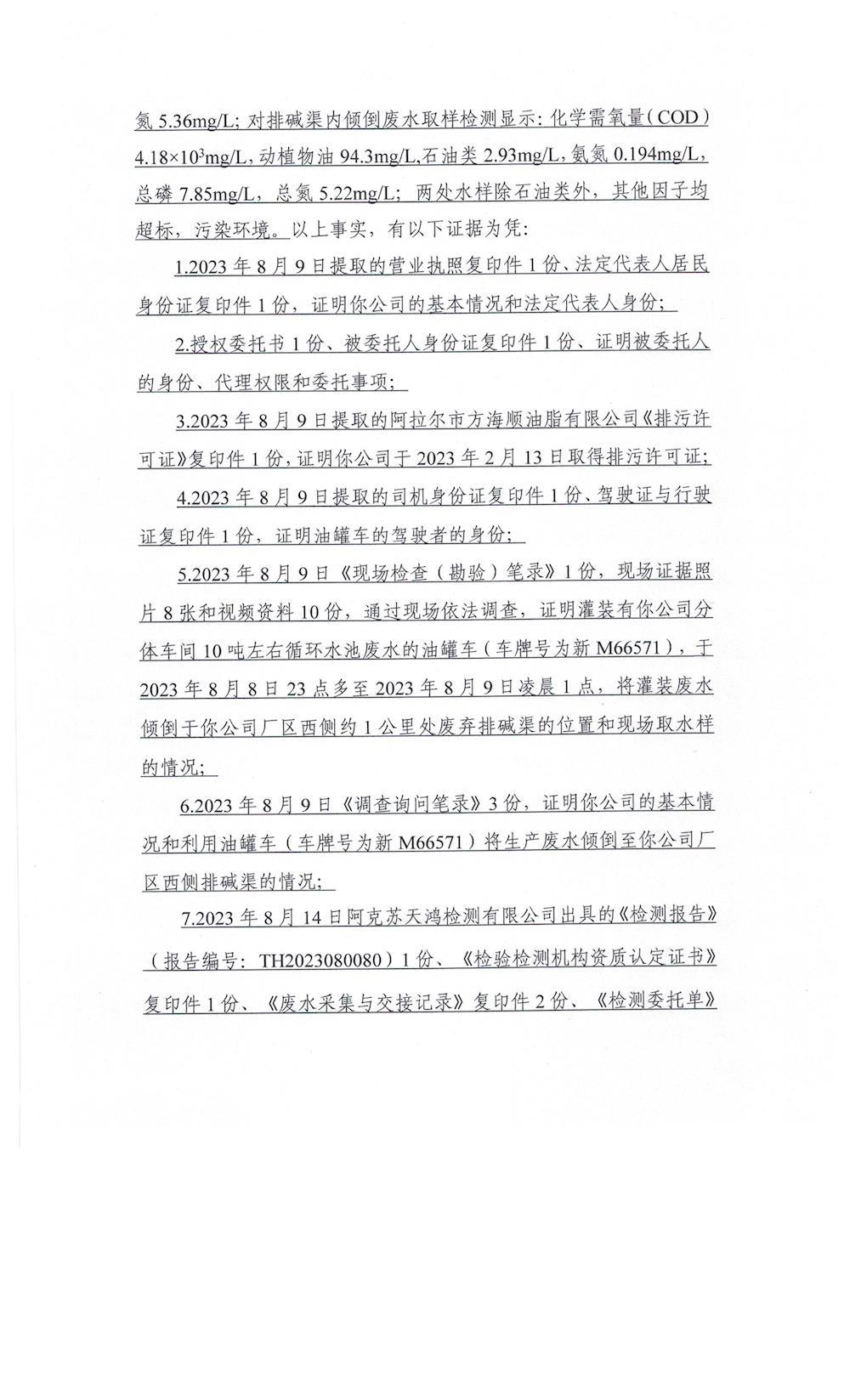 關于阿拉爾市方海順油脂有限公司《責令改正違法行為決定書》的公示