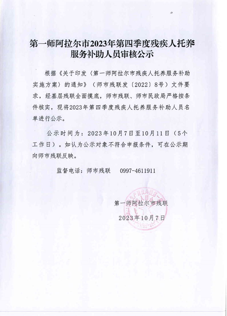 第一師阿拉爾市2023年第四季度殘疾人托養(yǎng)服務(wù)補(bǔ)助人員審核公示