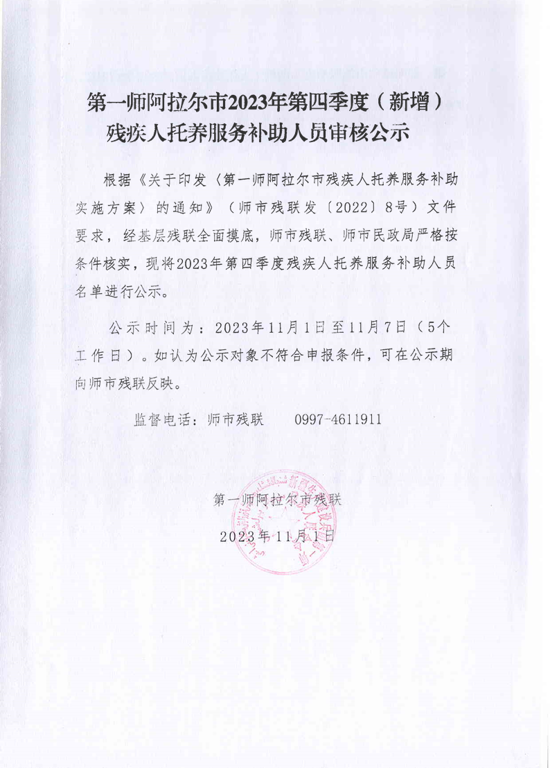 第一師阿拉爾市2023年第四季度(新增)殘疾人托養服務補助人員審核公示