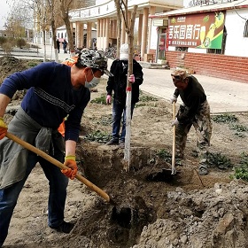 阿拉爾市西北興業投資發展集團有限公司各分公司組織全體工人對綠化帶、苗圃進行集中清掃,栽植新購花木,美化環境。
