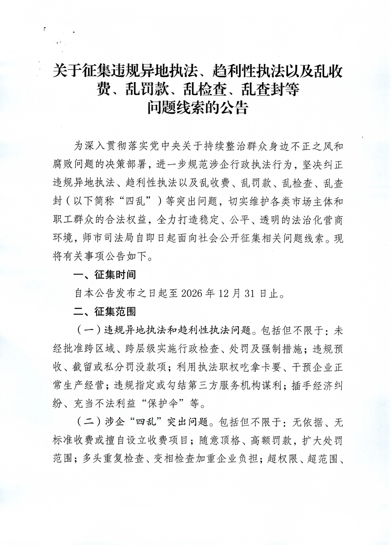 關于征集違規異地執法、趨利性執法以及亂收費、亂罰款、亂檢查、亂查封等問題線索的公告