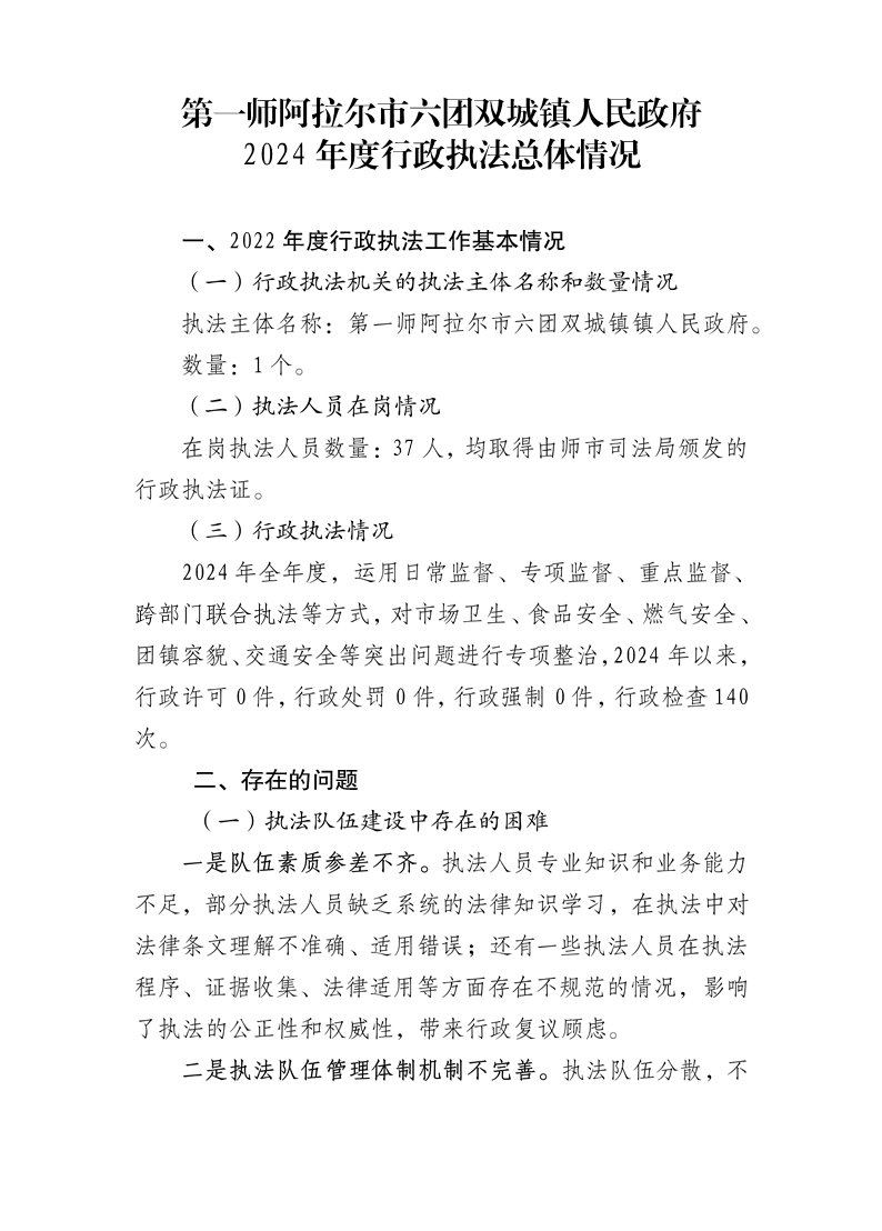 第一師阿拉爾市六團雙城鎮人民政府2024年度行政執法總體情況