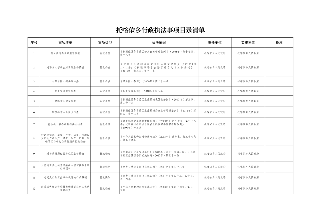 托喀依鄉(xiāng)行政執(zhí)法事項(xiàng)目錄清單