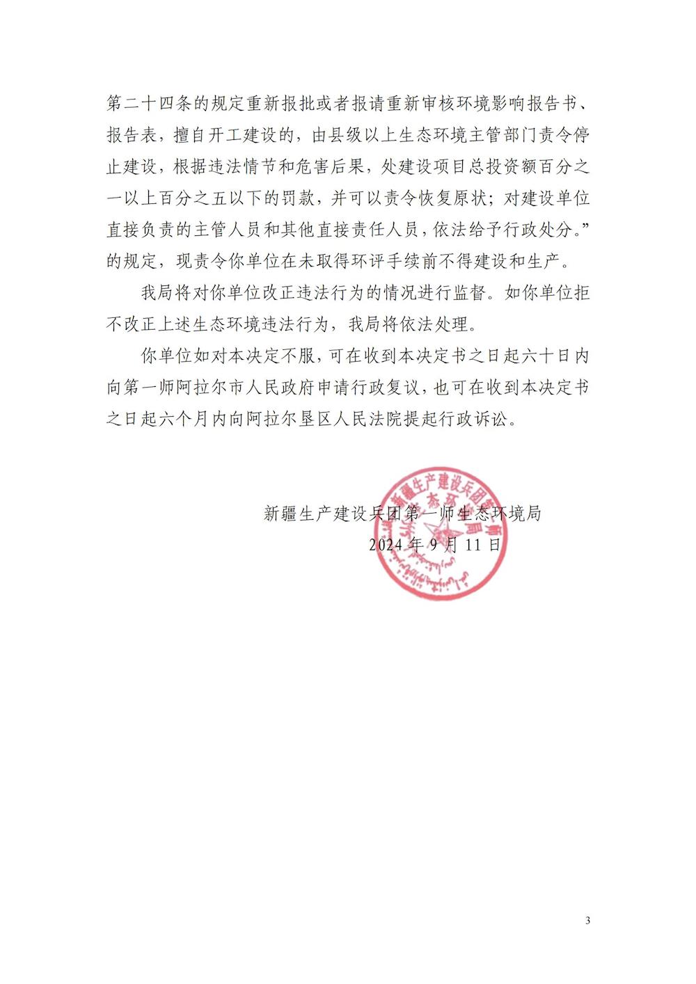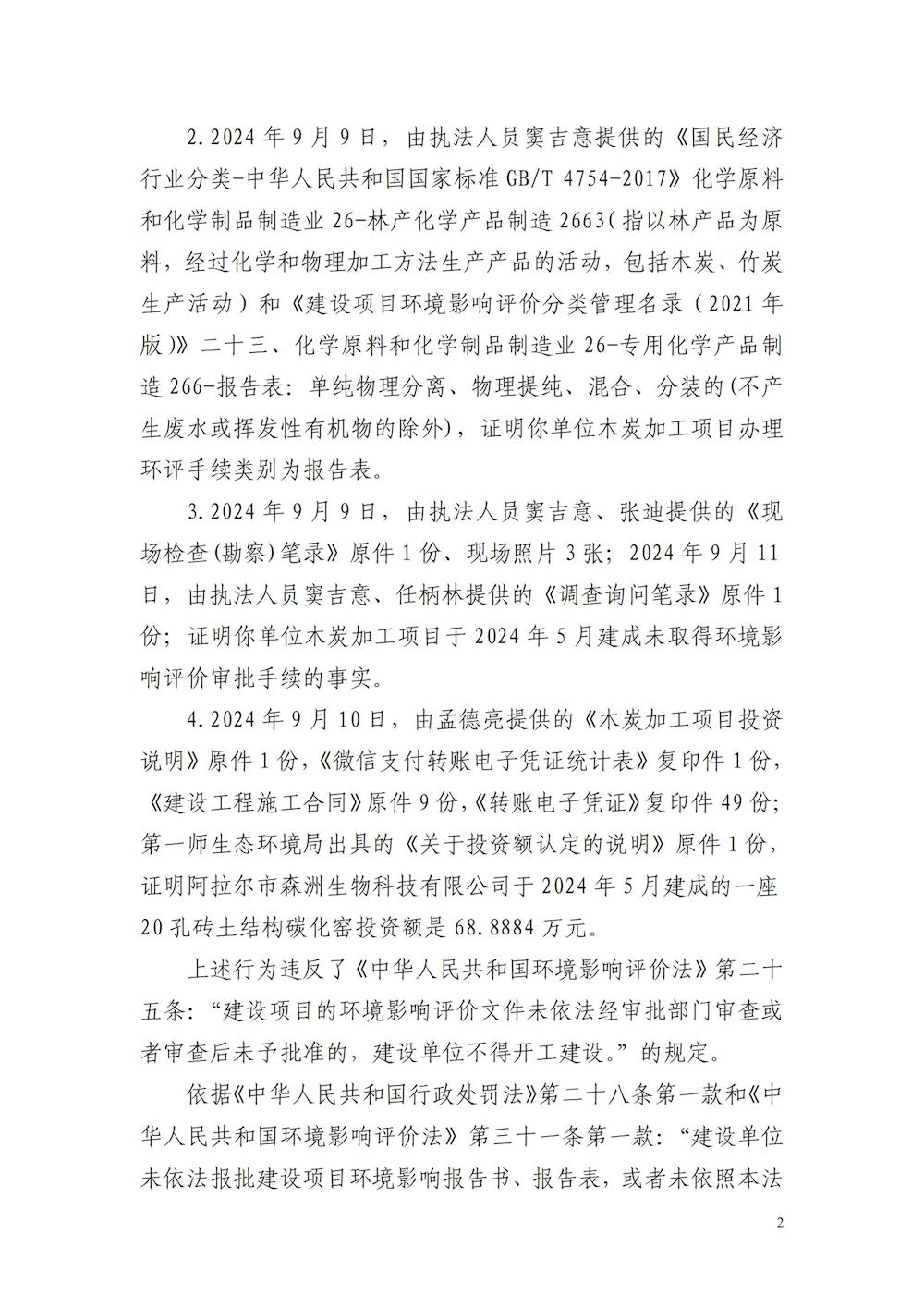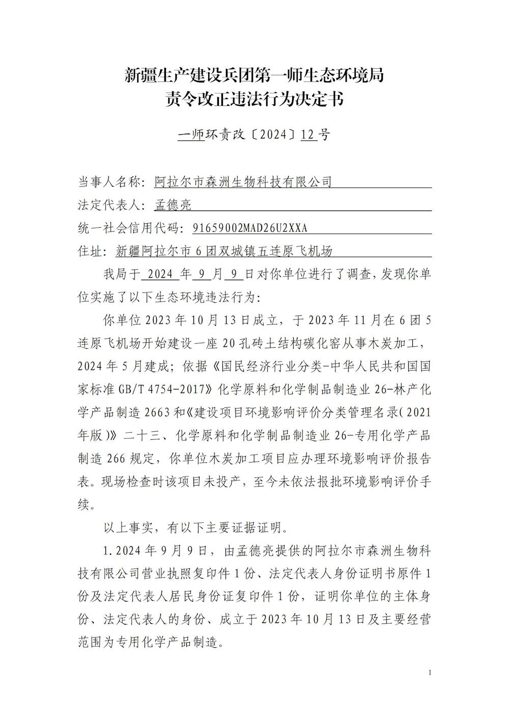 關于對阿拉爾市森洲生物科技有限公司《責令改正違法行為決定書》的公示