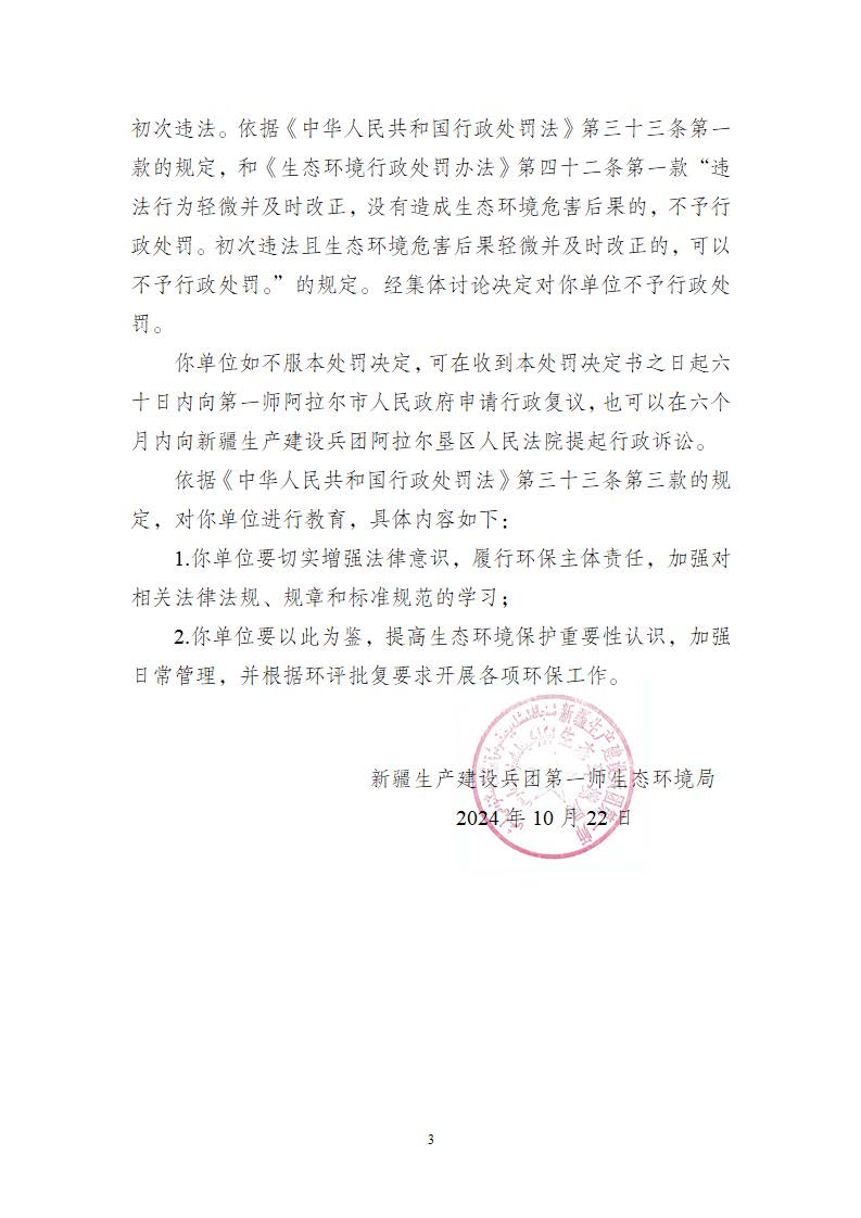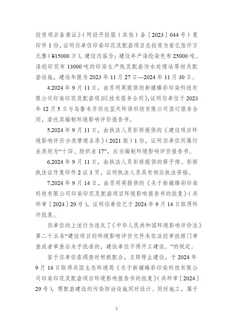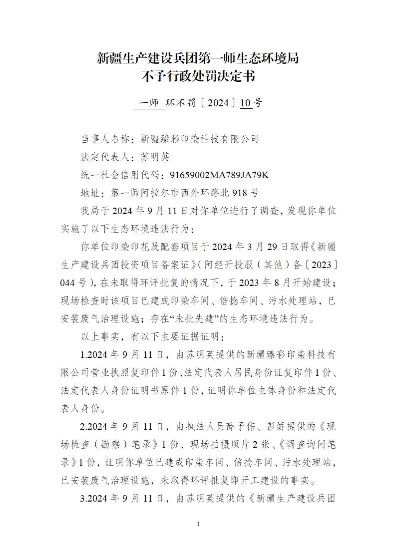 關于新疆臻彩印染科技有限公司《不予行政處罰決定書》的公示