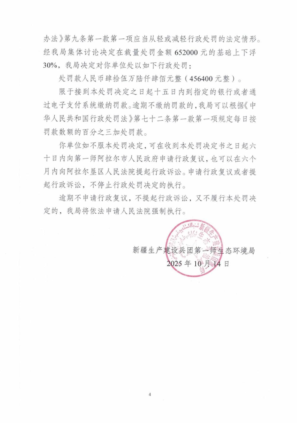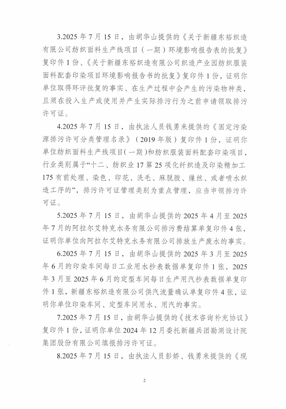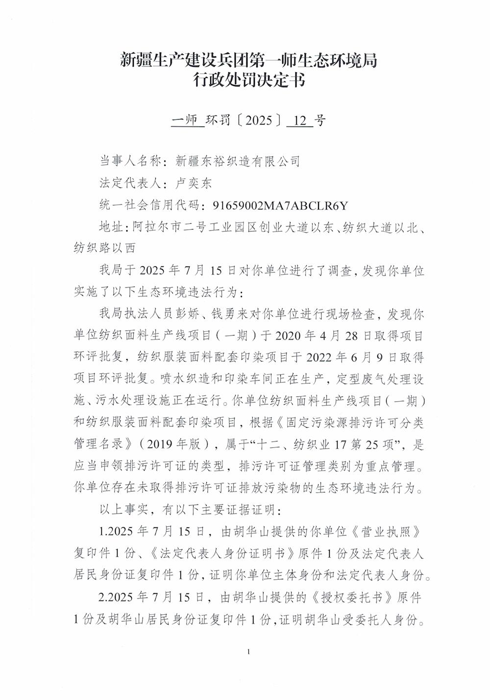 關于對新疆東裕織造有限公司《行政處罰決定書》的公示