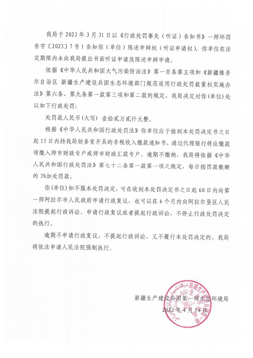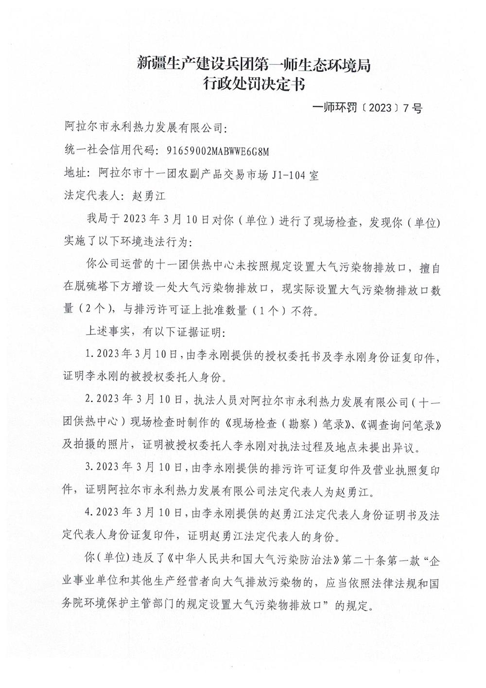 關于對阿拉爾市永利熱力發展有限公司《行政處罰決定書》的公示